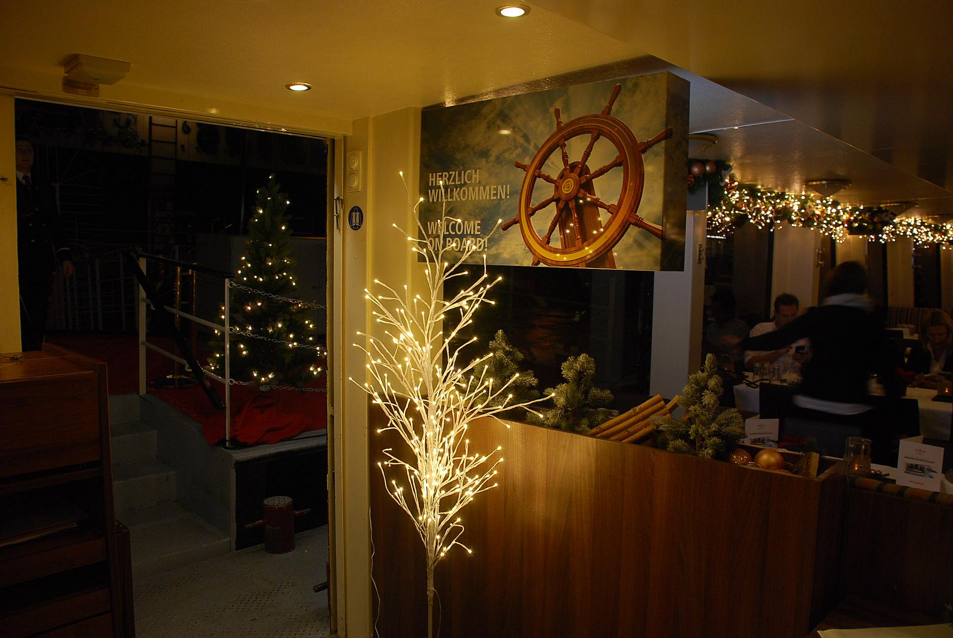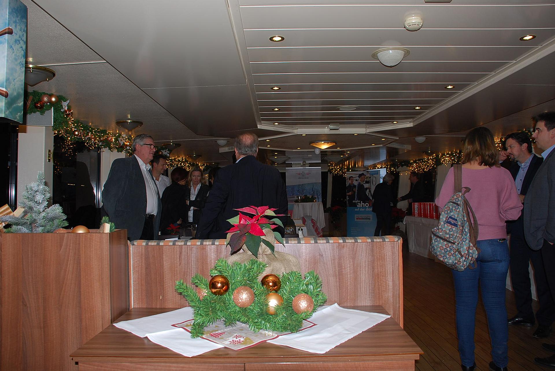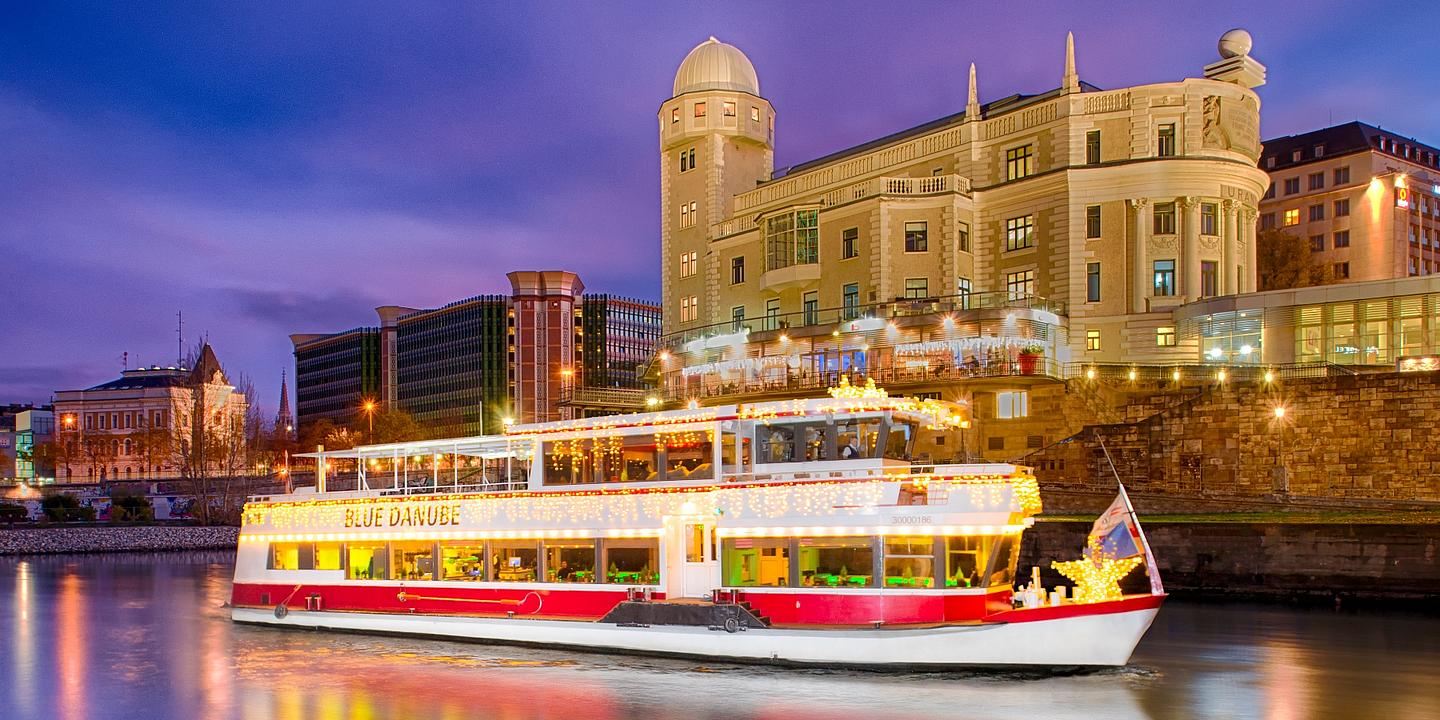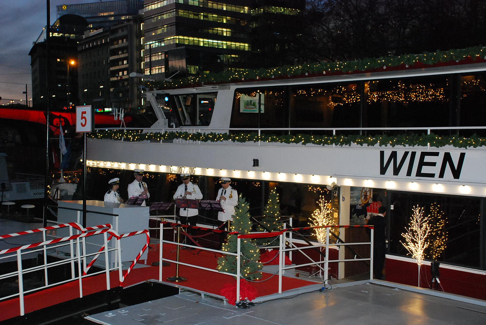 Vier Mal täglich an jedem Samstag im Advent, lädt das mit Weihnachtsschmuck prächtig verzierte Ausflugsschiff "Wien" ein, einen stimmungsvollen winterlichen Nachmittag auf der Donau zu erleben. Ein Bläserensmble begrüßt die Gäste bereits beim Einsteigen vor dem Schiff, inmitten des Stadtzentrums bei der Schiffstation am Schwedenplatz. Mit festlichen Tönen stimmen Sie das Publikum auf die schönste Zeit des Jahres ein. Duftender Punsch, Glühwein, heiße Erdäpfelspalten und knusprige Maroni wärmen die Finger und die Herzen, während man am Freideck, auch in der kalten Jahreszeit, Wien vom Wasser aus erleben kann. Im wohligen, warm beheizten Schiff verwöhnt die Crew die Passagiere auf Wunsch mit weihnachtlichen Lekerbissen wie einer traditionellen Erbsenrahmsuppe mit Würstelscheiben, einer Advent-Brettljause oder einem saftigen Apfelstrudel mit Kakao oder Kaffee dazu.