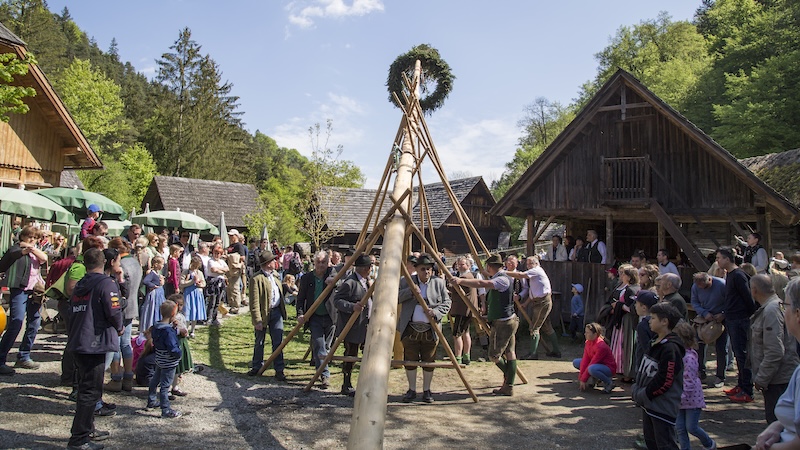 Ist der Maibaum prächtig aufgeputzt, rückt die Dorfjugend gemeinsam mit Vereinen wie der Feuerwehr Maibaum aus, um den Stamm aufzustellen. Traditionell ohne Kran, dafür mit jeder Menge Muskelkraft, langen Holzstangen (sogenannten "Spoteln" oder "Schwabeln") und viel Geschick wird der Baum Zentimeter für Zentimeter in die Höhe gewuchtet. Rundherum spielt die Musikkapelle auf, Schuhplattler und Bandltänzer sorgen für Stimmung. Nach dem erfolgreichen Aufstellen beginnt das Maibaumfest – ein ausgelassenes Miteinander mit Musik, Schmankerln und allerlei Brauchtum.