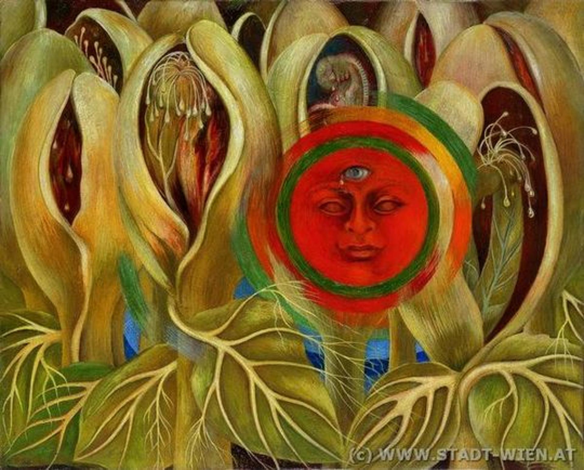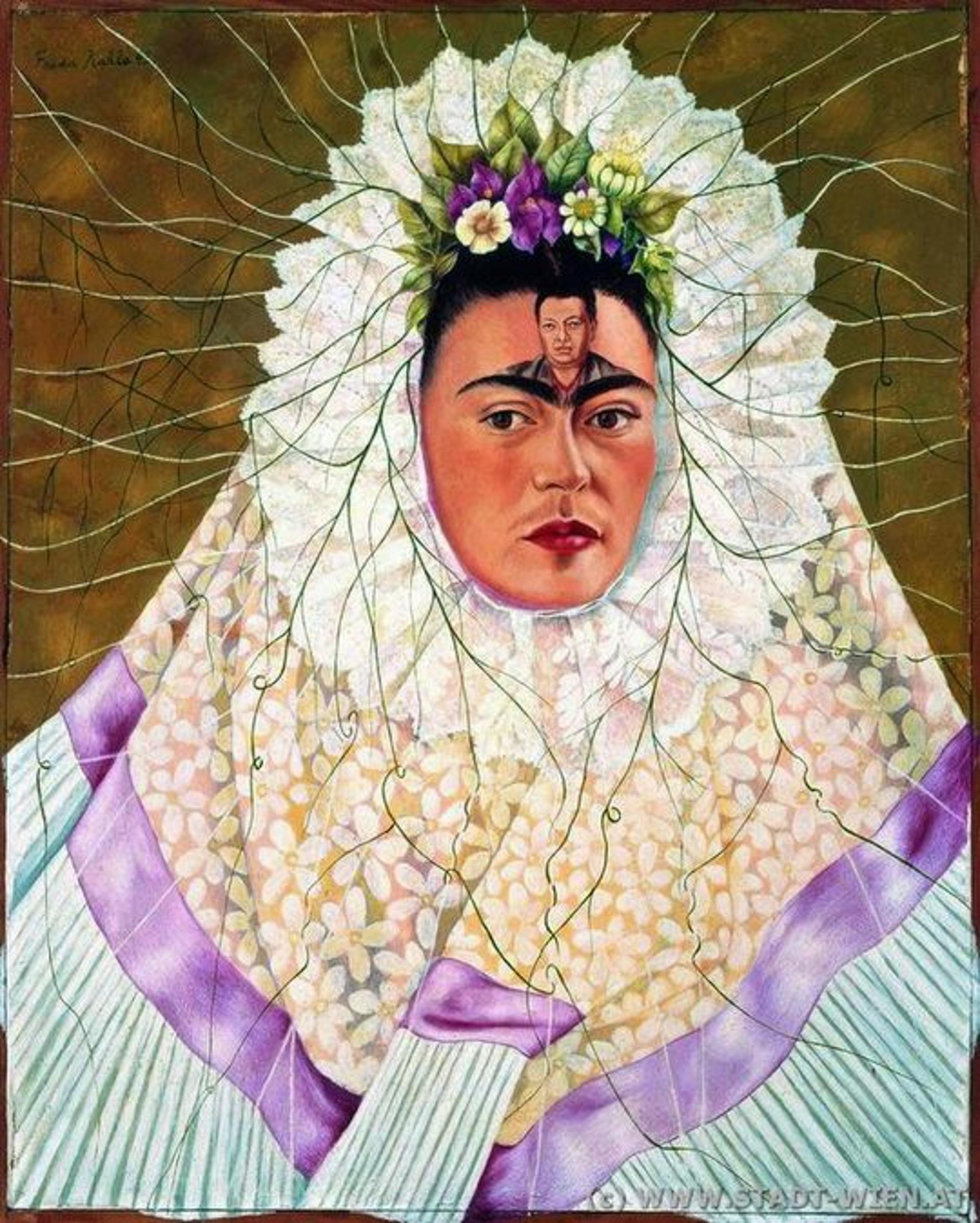 Frida Kahlo wird 1907 in Coyacán, Maxiko-Stadt, als Magdalena Carmen Frieda Kahlo Caldéron geboren. Die Tochter des deutschstämmigen Fotografen Guillermo Kahlo und seiner Frau Matilde Calderón erkrankt im Alter von 7 Jahren an, wie zunächst vermutet, Kinderlähmung, doch Jahre später diagnostiziert man als Ursache aller späteren Probleme eine vorgeburtliche Fehlbildung der Wirbelsäule. Ein Busunglück im Jahre 1925, bei dem ihr Unterleib von einer Stahlstange durchbohrt wird, durchkreuzt Frida Kahlo’s Pläne, Medizin zu studieren. Während einer langwierigen Genesungszeit beginnt sie zu malen, unter anderem ihr erstes Gemälde Selbstbildnis im Samtkleid, das unter anderem bei der Frida Kahlo-Retrospektive in Wien gezeigt wird.