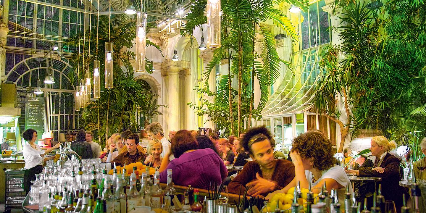 Mit Blick auf den Burggarten zeigt das Palmenhaus als CAFE - BRASSERIE - BAR seit 1998 seinen Gästen die Hohe Kultur des Schmausens. 1882 von Kaiser Franz Joseph in Auftrag gegeben ist es heute mit 111 Metern nicht nur Wien längstes Restaurant, sondern auch eines der sonnigsten. Die Stahl-Glaskonstruktion an einem Seitentrakt der Hofburg hat auch eine herrliche Terrasse mit Blick auf den Burggarten. Zwischen exotischen Pflanzen werden Kaffee und hausgemachte Mehlspeisen, aber auch sehr gute warme Küche serviert. Abends gibt es feine Cocktails und die freitägliche DJ-Line bringt vorwiegend Electronica, Marke "entspannte Grooves".