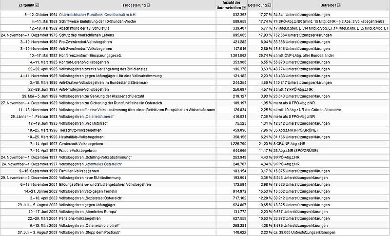 In Österreich wurden bisher 32 Volksbegehren durchgeführt, das erste Volksbegehren fand im Jahr 1964 statt. In der zweiten Republik wurde das Volksbegehren als Mittel der direkten Demokratie ein wichtiger Faktor in vielen politischen Entscheidungen! Dabei wurden viele Volksbegehren initiiert, die heute wohl kaum mit der Relevanz der Bürgerinitiative von Hannes Androsch gleichgestellt werden können (z.B. das "Pro Mottorad" Volksbegehren). Andere Volksbegehren wiederum scheinen heute aktueller denn je zu sein...