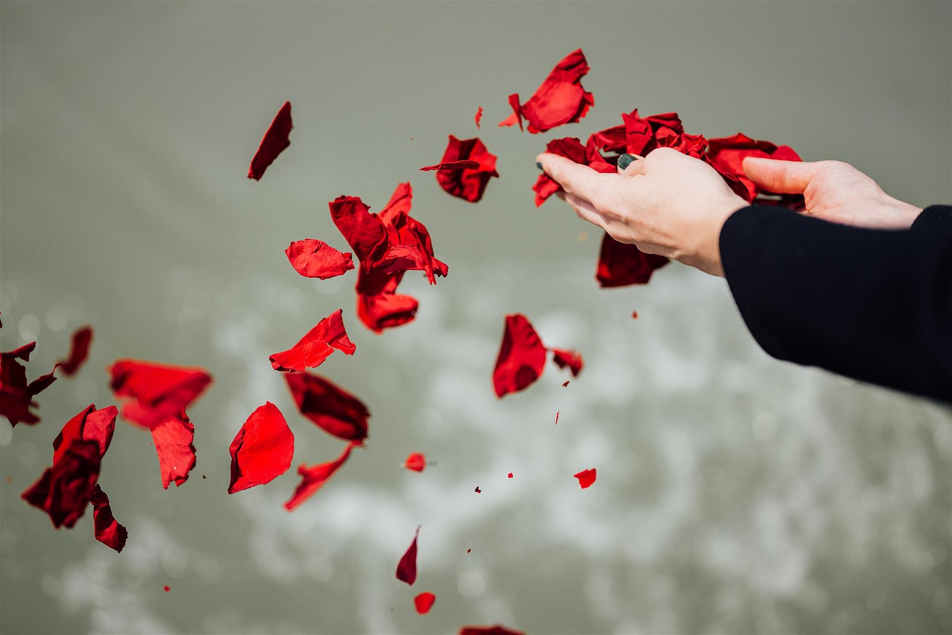 Ascheverstreuung: Die Asche wird sanft in die Donau gestreut und verweilt kurz auf der Wasseroberfläche, bevor sie im Fluss aufgeht.