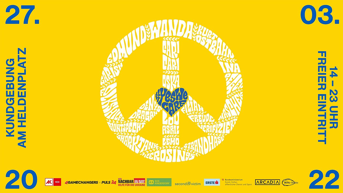 "Die langfristigen Folgen des entsetzlichen Krieges in der Ukraine sind noch völlig unabsehbar. Was aber bereits feststeht: Unzählige Menschen befinden sich in unvorstellbarer Not, Hunderttausende sind auf der Flucht. (...) Deshalb haben sich Teile der österreichische Kunst- und Kulturszene (...) mit der #YesWeCare-Bewegung zusammengeschlossen. Redner:innen, Musiker:innen, NGOs u.v.m. werden sich am 27. März ab 14:00 am Wiener Heldenplatz versammeln und ihre Stimme erheben. Gemeinsam wollen wir laut sein."