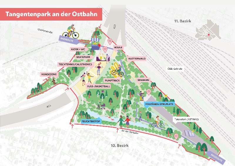 Mit dem Projekt gelingt uns ein echtes Paradebeispiel unserer "Raus aus dem Asphalt"-Strategie. Anstatt einer betonierten, unbenutzten Autobahn-Abfahrt wird es künftig einen blühenden Landschaftspark mit Sport- und Freizeitmöglichkeiten geben. Zugleich schaffen wir auch eine echte Grünschneise auf über 3 Kilometer vom Helmut-Zilk-Park über das Stadtentwicklungsgebiet Kempelenpark bis hin zu den Großgrünräumen im Südraum von Favoriten wie Laaer Wald und Löwygrube. Neue Fuß- und Radwege verbessern auch die Vernetzung der angrenzenden Wohngebiete. Wo bislang eine Betonabfahrt und Lagerplatz der ASFINAG waren, kommt mit dem neuen Tangentenpark an der Ostbahn ein absolutes Freizeit- und Klimaparadies.