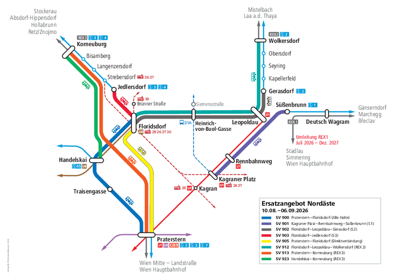 Zusätzlich sind von 10. August bis 6. September 2026 auf den nördlichen Anschlussstrecken zwischen Floridsdorf und Jedlersdorf, Gerasdorf sowie Süßenbrunn Sperren notwendig.
