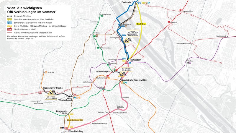 Hinweis: Gleichzeitig mit der Sommersperre der Stammstrecke wird auch an der U4 gearbeitet. Von 3. Juli bis 3. August 2026 ist die U4 wegen Gleisbauarbeiten nahe der Station Schwedenplatz geteilt. Sie verkehrt zwischen Heiligenstadt und Schwedenplatz sowie zwischen Hütteldorf und Landstraße / Wien Mitte (kein Betrieb zwischen Schwedenplatz und Landstraße).