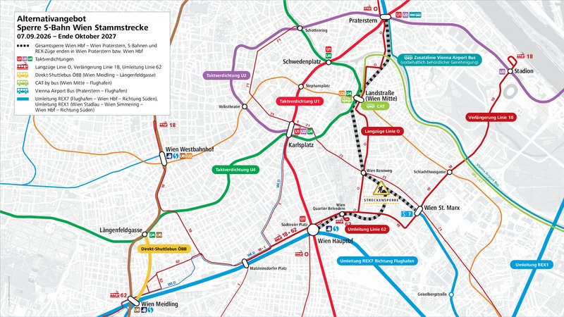 Nach der Sommersperre folgt von 7. September 2026 bis Ende Oktober 2027 die 14-monatige Sperre des zentralen Abschnitts S-Bahn-Stammstrecke zwischen Wien Praterstern und Wien Hauptbahnhof.